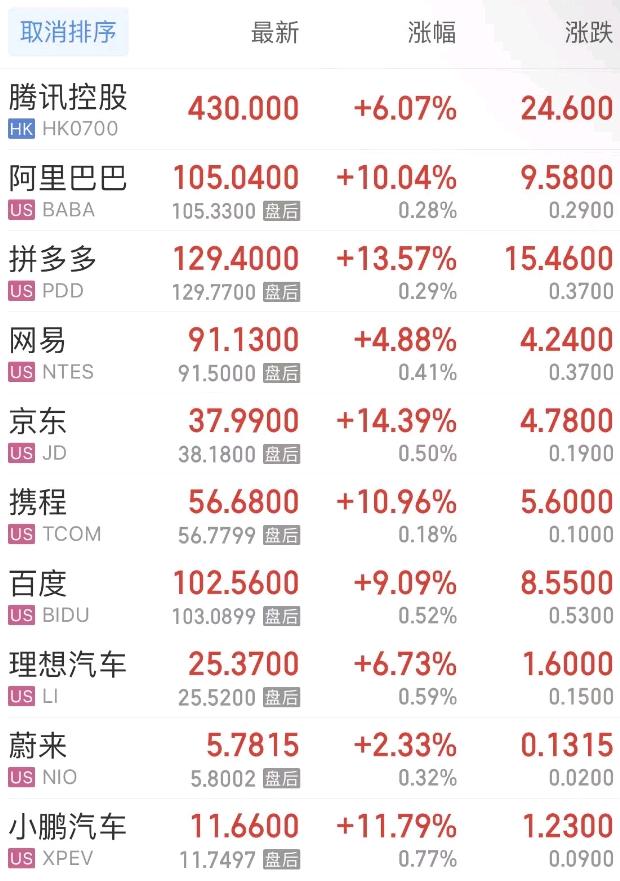 热门中概股全线大涨,腾讯控股(港股)涨6.07%,阿里巴巴涨10.04%,拼众众涨13.57%,网易涨4.88%,携程涨10.96%,百度涨9.09%,理思汽车涨6.73%,蔚来涨2.33%,小鹏汽车涨11.79%。