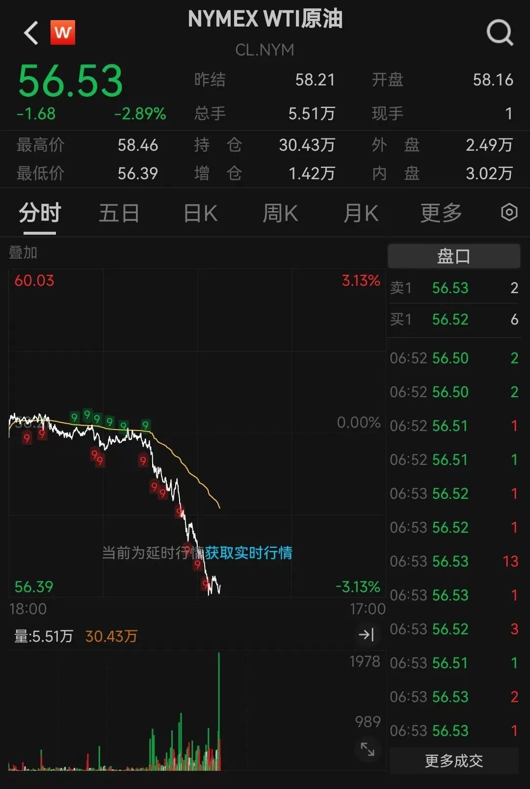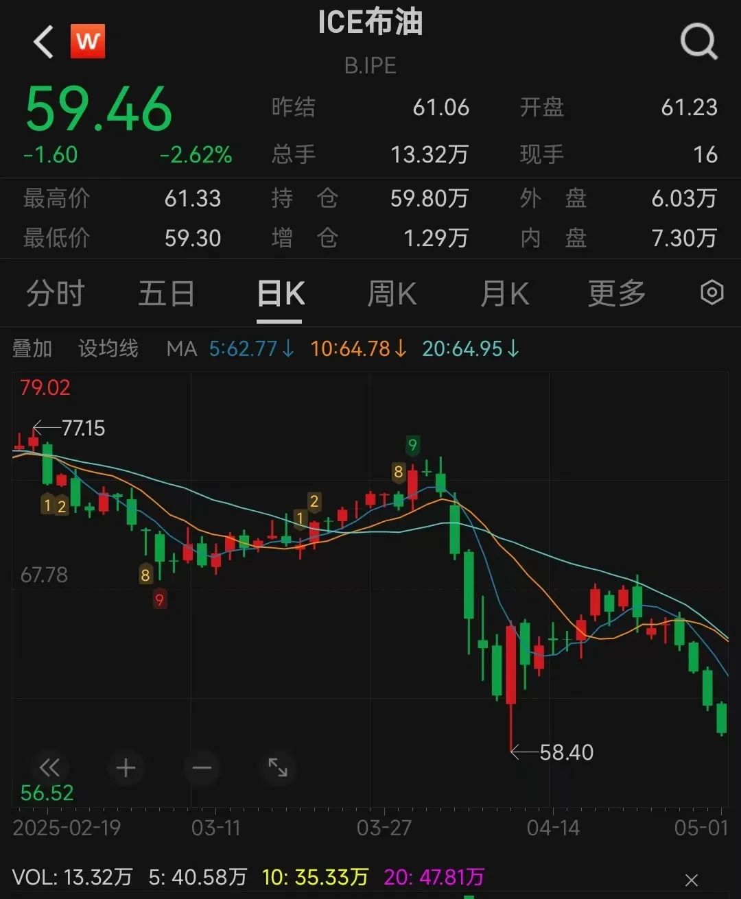 国际原油行情走势图一方面是为了惩罚超过配额的欧佩克+成员国跌幅夸大近3%,报56.53美元/桶;布伦特原油期货跌2.62%,报59.46美元/桶,失守