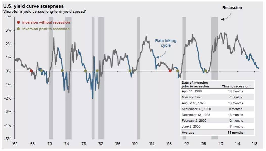说到邦债收益率,不得不提客岁商场忧愁的长端利率和短端利率涌现倒挂。史书上看,每一次长端利率和短端利率涌现倒挂之后,都市发作经济阑珊。倒挂意味着,恒久经济增进预期下滑,不过短期的通胀和资金本钱上升。只是,利率倒挂之后,并非立即发作经济阑珊。从过去50众年的史书看,倒挂之后均匀14个月才发作经济的阑珊。