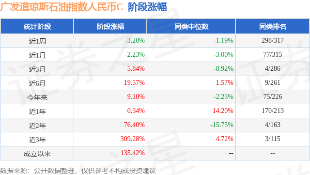 从功绩展现来看,广发道琼斯石油指数群众币C基金过去一年净值涨幅为0.34%,正在同类基金中排名170/213,同类基金过去一年净值涨幅中位数为14.2%。而基金过去一年的最大回撤为-19.67%,创建往后的最大回撤为-65.54%。