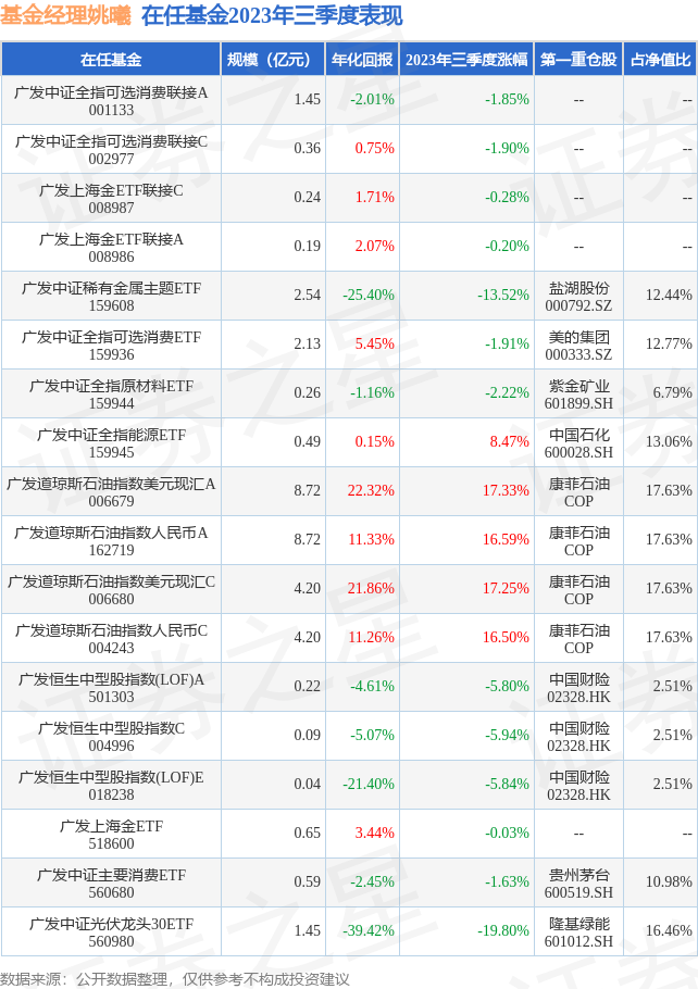 广发道琼斯石油指数群众币C现任基金司理为姚曦。个中正在任基金司理姚曦已从业1年又345天,2022年11月15日正式接办统治广发道琼斯石油指数群众币C,任职岁月累计回报为-1.57%。目前还统治着18只基金产物(包罗A类和C类),个中本季度展现最佳的基金为广发道琼斯石油指数美元现汇A(006679),季度净值涨幅为17.33%。