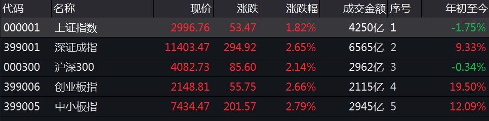 截至收盘,沪指涨1.82%,报2996点,深成指涨2.65%,报11403点,创业板指涨2.66%,报2148点。墟市成交额持续两日冲破万亿元,两市近140只个股涨停。(详睹不畏浮云遮望眼,桂林一枝红盘收)