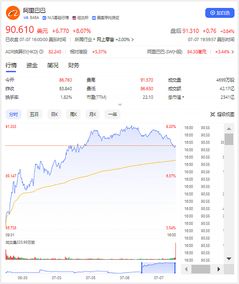 市集以为这是“靴子落地,利空出尽”,当晚,阿里巴巴(BABA.N)美股盘前一度涨超3%。截至7月7日收盘,阿里巴巴美股(涨8%,报90.61美元/股。