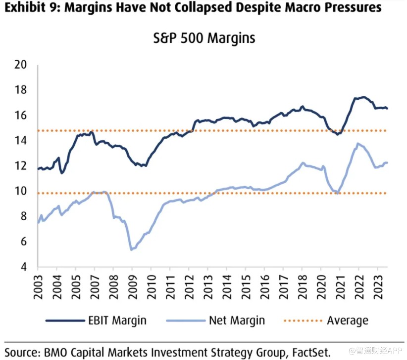 跟着2021年通胀率飙升,阐述师们确信,本钱上升将挤压利润率。但到底正好相反:利润率本质上上升到了创记录的秤谌。正在此时代,很众公司或许通过升高代价将更高的本钱转嫁给客户。再加上运营结果的升高,企业完毕了创记录的利润。这提示咱们,“低估美邦企业是危害的”。