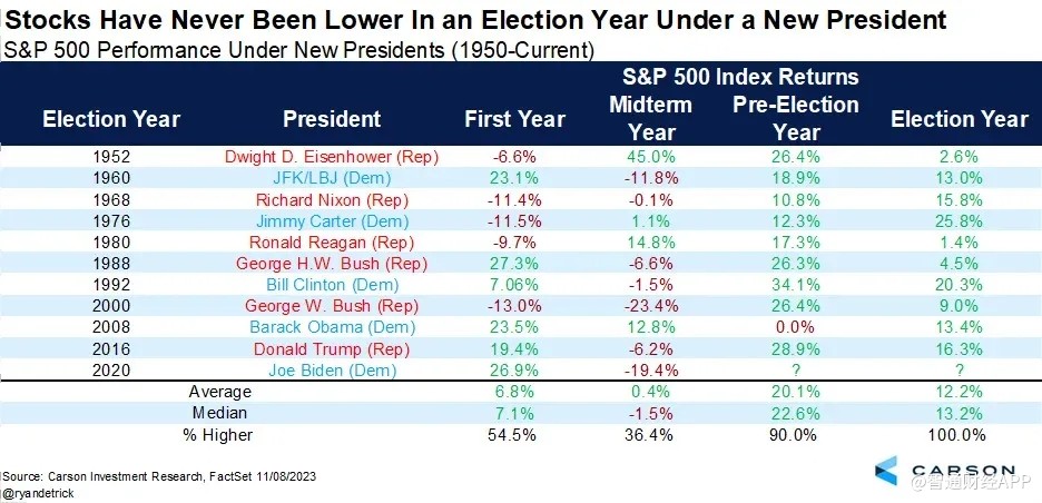 Carson Group首席市集政策师Ryan Detrick吐露:“正在新总统上任的推选年中,股市从来走高!过去10次都上涨和12.2%的均匀涨幅阻挠小看,这与2024年可以展现的低两位数回报率划一。”