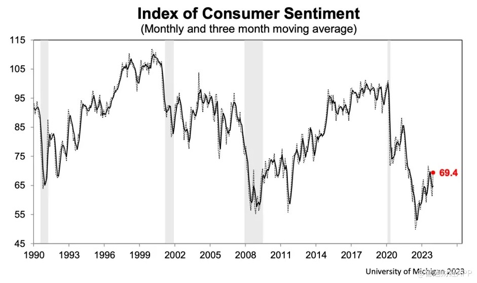 凭据密歇根大学的呈报,2023年12月份消费者信念指数飙升13%,抹去了此前四个月的通盘跌幅,这主假如基于通胀预期轨迹的改革。