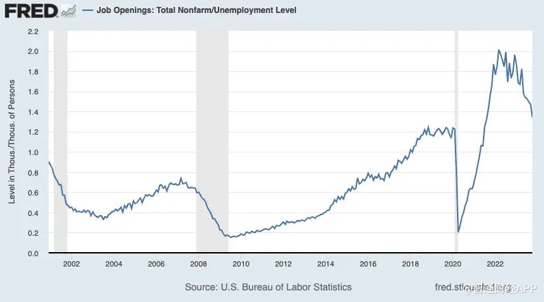 凭据美邦劳工统计局的考察,2023年10月份名望空白降至873万个,远低于市集预期,也低于2022年3月1203万个的高点。
