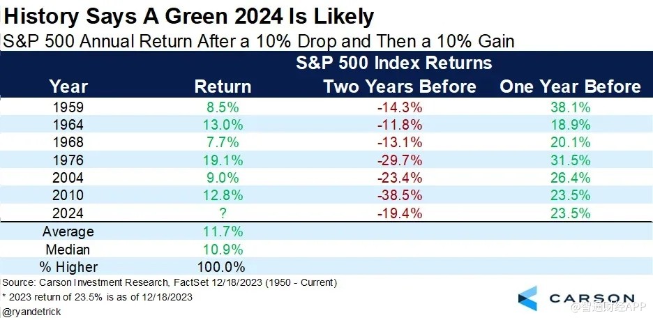 Detrick还吐露:“当股市下跌横跨10%(如2022年),然后上涨横跨10%(如2023年),接下来的一年往往相当安靖。六次犹如情况均录得上涨,均匀涨幅为11.7%。”