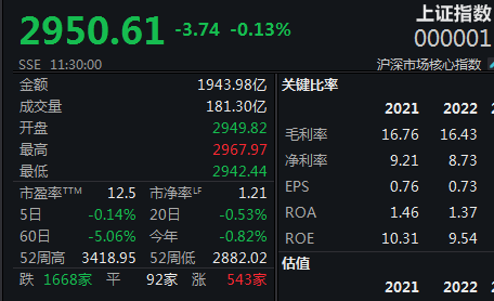 今日,沪指一度红盘轰动,创业板指冲高回落创阶段新低。截至上午收盘,上证指数跌0.13%报2950.61点,深证成指跌0.24%,创业板指跌0.61%,北证50跌1.25%。A股半日成交4531.1亿元,环比略增;北向资金小幅净卖出4亿元。