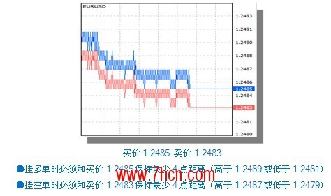 此外必要防卫的是,往还商会规则挂单价位和物价必需有必定的点差隔断,如比兴业投资的HY Trader MT4平台,规则挂单价位和物价起码有4个点差的隔断,以下图为例: