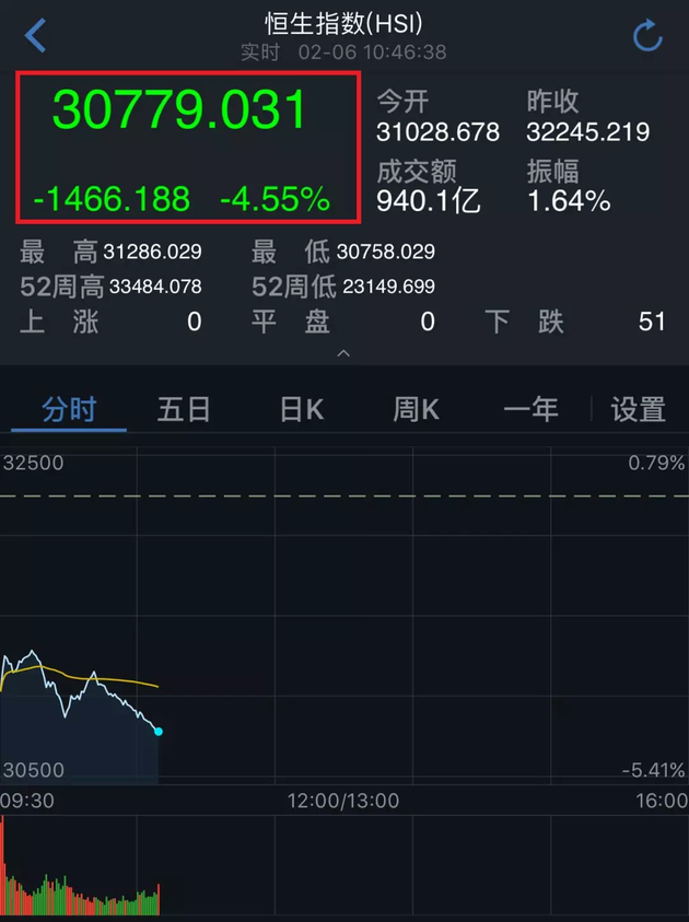 受到昨日美股暴跌的影响,今日港股开盘即大跌赶过1200点,开盘报31028点,比昨日收盘的32245点,下跌了3.8%,为近期港股最大的单日跌幅。