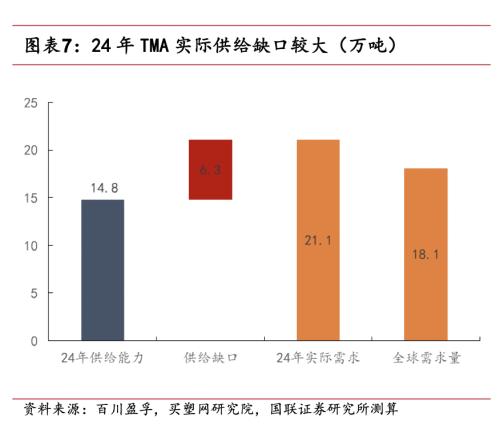 邦联证券研报指出,TMA代价向上颇具弹性和络续性。2024年现实需求约可量化为21.1万吨,提供缺口达6.3万吨,约占现实总需求的30%。叠加TMA的刚需属性且短期无新增产能投放,TMA 高景气周期希望络续较长岁月。
