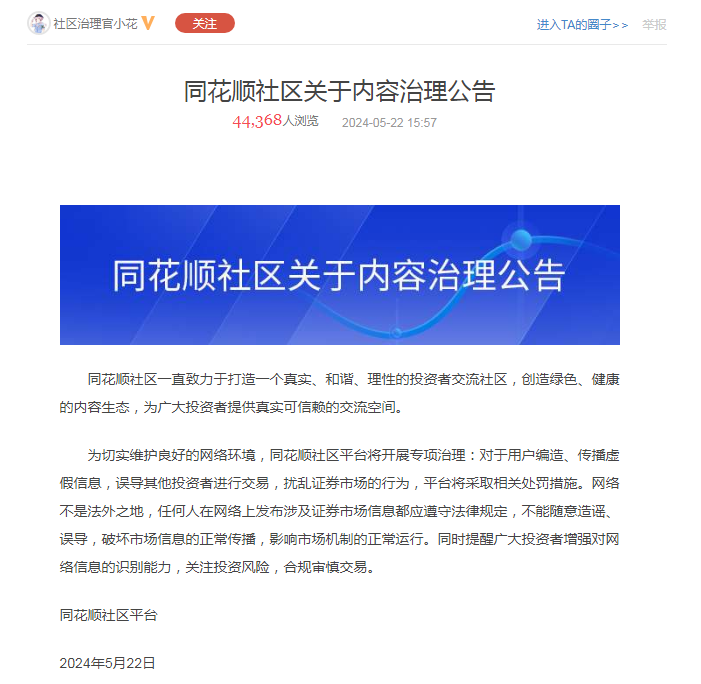 5月22日,同花顺社区平台也宣告布告称,为实在保卫优越的搜集情况,同花顺社区平台将展开专项管理:对待用户编造、散布作假音信,误导其他投资者实行交往,骚扰证券墟市的活动,平台将接纳干系责罚设施。