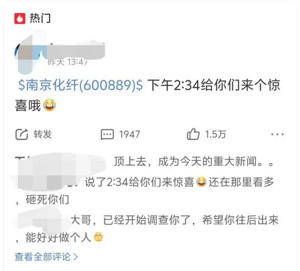 5月20日,南京化纤股价上演“寰宇板”,公司股价短短一分钟内从涨停到跌停,激发了墟市的遍及合切和质疑。诡异的是,竟有股民当天提前发帖精准预言了南京化纤的跌停。