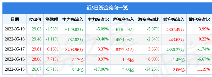 行情股市行情如对该内容存在异议资金流向数据方面,5月19日主力资金净流出6129.03万元,逛资资金净流出6110.29万元,散户资金净流入4807.49万元。