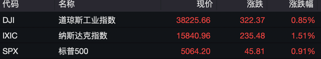 外地年光5月2日周四,美股三大股指全线收涨。截至收盘,道指涨322.37点,涨幅为0.85%,报38225.66点;纳指涨235.48点,涨幅为1.51%,报15840.96点;标普500指数涨45.81点,涨幅为0.91%,报5064.20点。