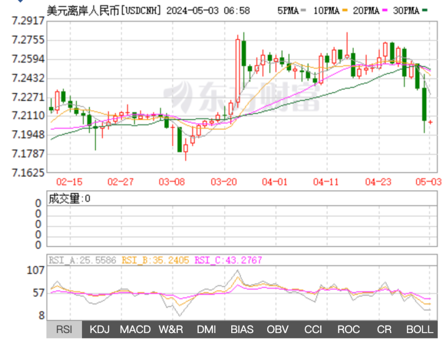 别的,离岸公民币兑美元汇率也大幅上涨。外地年光5月3日,离岸公民币(CNH)兑美元北京年光04:59报7.2063元,较周三纽约尾盘涨278点,盘中团体交投于7.2451—7.1952元区间。