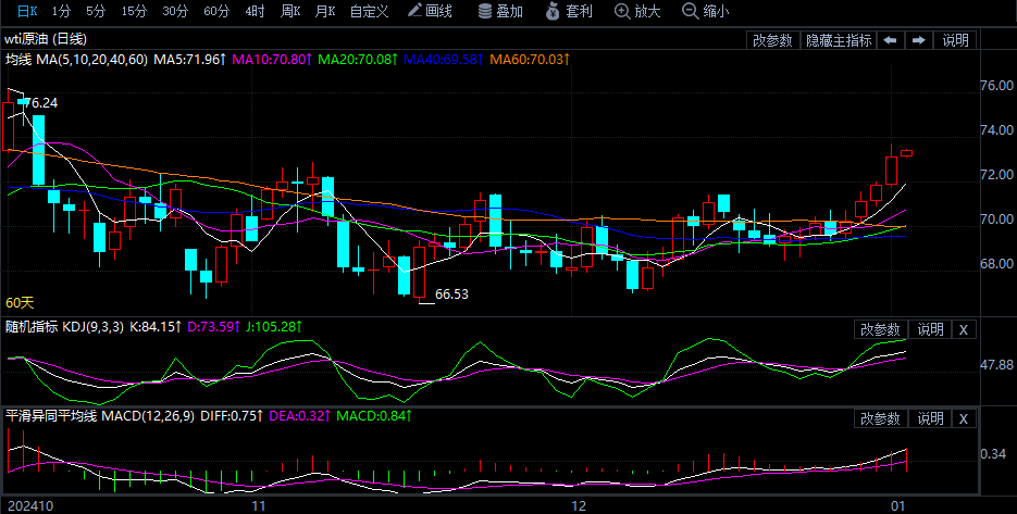 原油走势回想:木曜日(1月2日)亚盘开盘,美原油价值进一步延续众头反弹,冲破72整数闭口,目前交投于72.2美元/桶左近。昨日俄自然气过境乌克兰输欧和说到期,导致邦际自然气价值大幅上涨,刺激油市动摇转强。