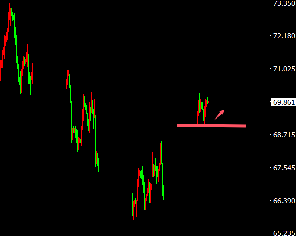 原油周处处于区间窄幅振撼,当天最低69.1,最高69.9,日线,日线看仍是待冲破,四小时线,振撼上行,小时线,振撼,综述日内还将接连振撼,先看70的冲破环境,下方接连合心69和68