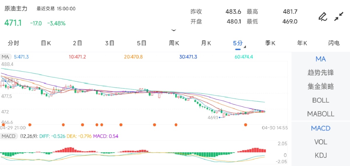 4月30日,邦内期市能化板块无数飘绿。此中,原油期货主力合约开盘报480.1元/吨,今日盘中低位振动运转;截至午间收盘,原油主力最高触及481.7元,下方探低470.3元,跌幅达3.59%。