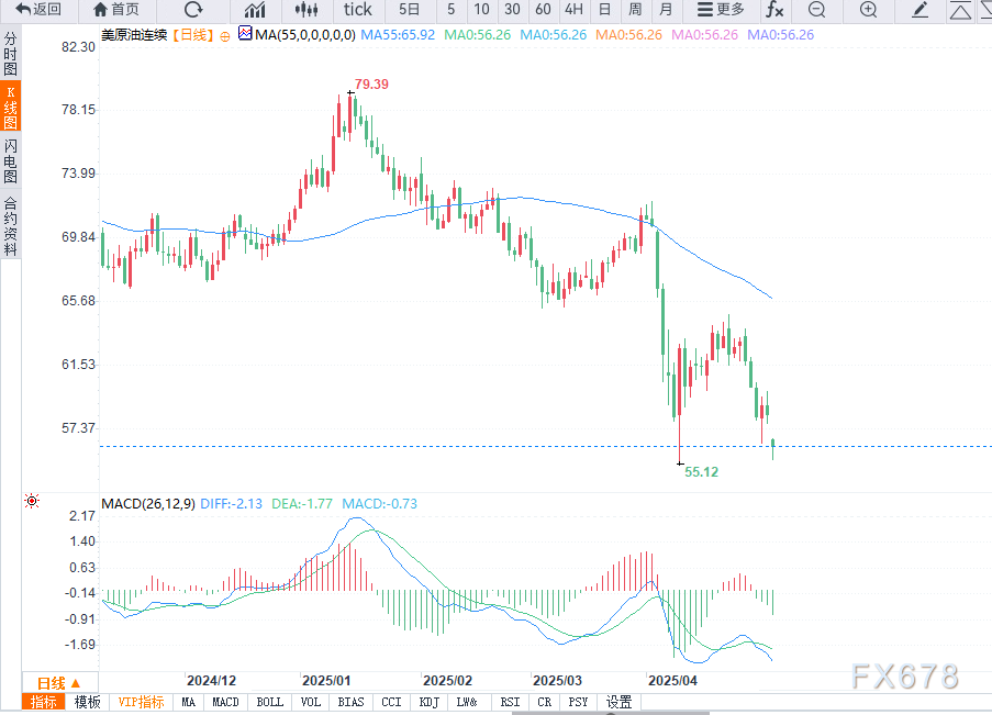 从美原油(WTI)日线图来看,价值大幅跌破此前60美元维持,眼前交投于56.00美元左近,暴露出显明的破位状态。