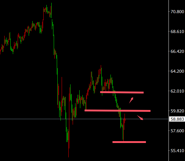 原油周四不绝动摇下行,先跌再反弹,当天最低来到56.3,随后大反弹,最高来到59.4,日线,日线看油价仍偏空,四小时线,呈动摇下行,现受阻于中轨,先看60能否上破,小时线,动摇,综述日内操作思绪趋向空头稳固,但偏动摇,从昨反弹力度看,若无音信面影响油价难再破低,上破60则看61.5
