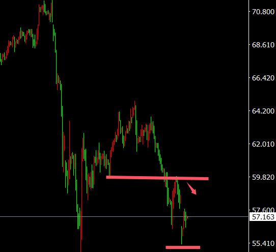 原油周一因墟市音讯称欧佩克+将一连加快增产,开盘跳空2美金,且低开低走,最低来到55.3一线,亚欧盘未延续下跌,振撼,最高来到57.6,日线,跳空白口未补完,从日线看趋向仍偏空,先看能否回补缺口58.5,四小时线,处于下行通道,偏振撼,小时线,区间振撼,短线区间振撼,综述日内操作思绪看空不追空,以振撼为主,体贴音讯面影响,下破55一线,以振撼空为主