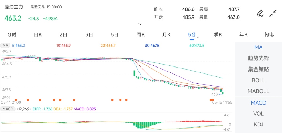 金投网发布此文目的在于促进信息交流,美股价格实时行情金投网APP行情核心数据显示,截止2025年5月15日下昼15:00收盘,原油期货主力合约行情音讯:最新价:463.2,涨跌:-24.3,涨跌幅:-4.98%,成交量:81962,开盘价:485.9,昨收价:486.6,最高价:487.7,最低价:463.0。