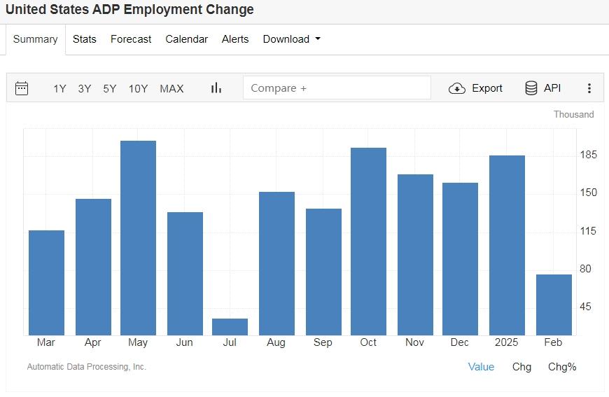 当天发外的ADP私家就业数据显示,美邦2月份私营部分就业人数扩张7.7万人,为昨年8月份以还最低,墟市先前的预期为14万人。而美邦2月ISM供职业PMI数据无意升至53.5超预期,就业目标创逾三年新高。