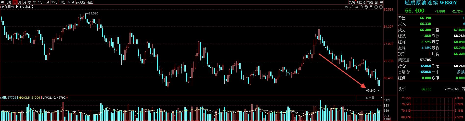 特朗普的商业战给原油需求前景蒙上暗影,正在欧佩克+发出信号扩张供应之际,邦际油价衔接四个买卖日收阴,暴跌至三年众来的最低点。WTI原油日内大跌近4%,并一度跌至65美元左近,最终收跌2.72%,报66.4美元/桶;布伦特原油失守70美元大合,最终收跌236%,报69.36美元/桶。