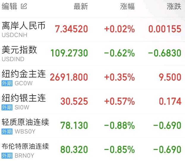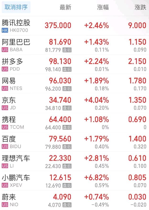热门中概股方面,腾讯控股(港股)涨2.46%,阿里巴巴涨1.43%,拼众众涨2.24%,网易涨1.89%,携程涨1.08%,百度涨1.79%,理思汽车涨2.81%,小鹏汽车涨6.82%,蔚来涨0.74%。