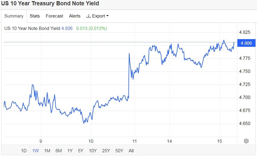 美债收益率涨跌纷歧,基准的10年期美债收益率收报4.793%;对货泉战略更敏锐的两年期美债收益率收报4.384%。