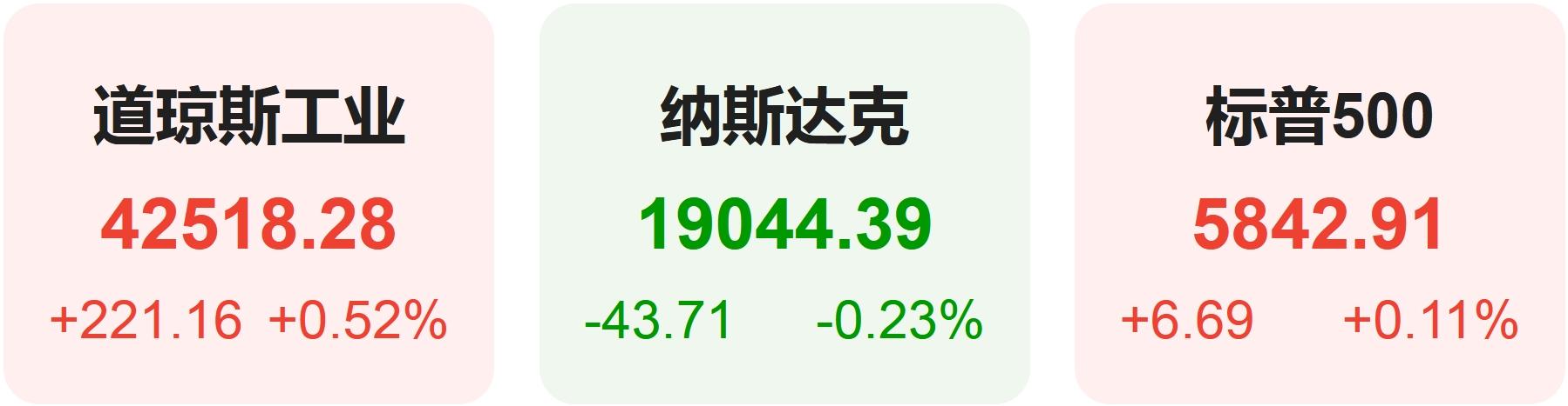 截至收盘,道琼斯指数涨0.52%,报42,517.79点;标普500指数涨0.11%,报5,842.86点;纳斯达克指数跌0.23%,报19,044.39点。CPI前夜,科技股延续跌势,投资者涌入古代公用奇迹、金融和质料股。