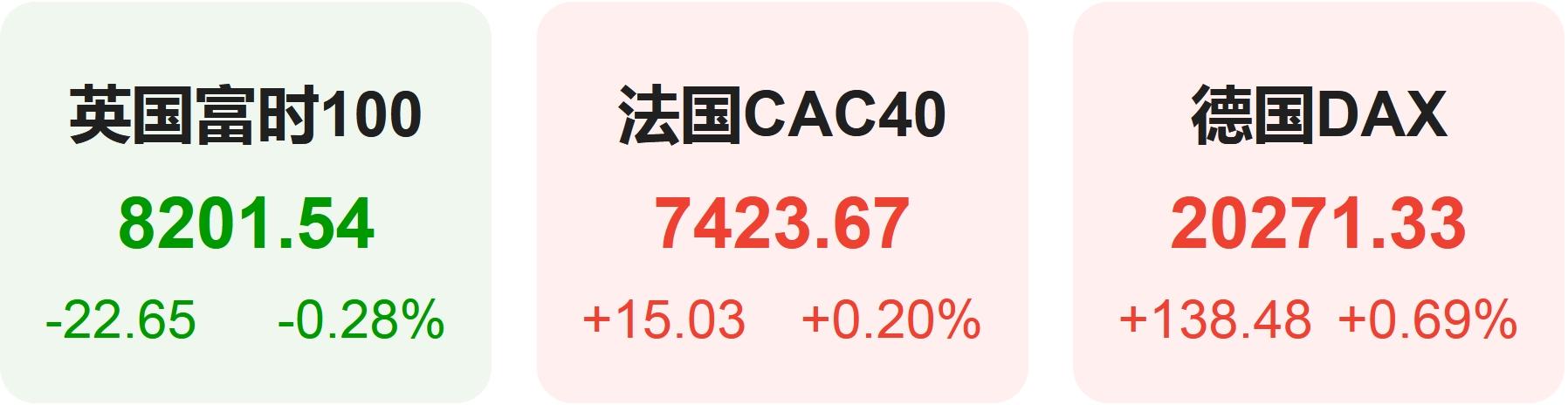 欧洲股市方面,英邦富时100指数小幅下跌0.28%,报8202点。法邦CAC40指数小幅上涨0.20%,报7424点。德邦DAX指数小幅上涨0.69%,报20271点。