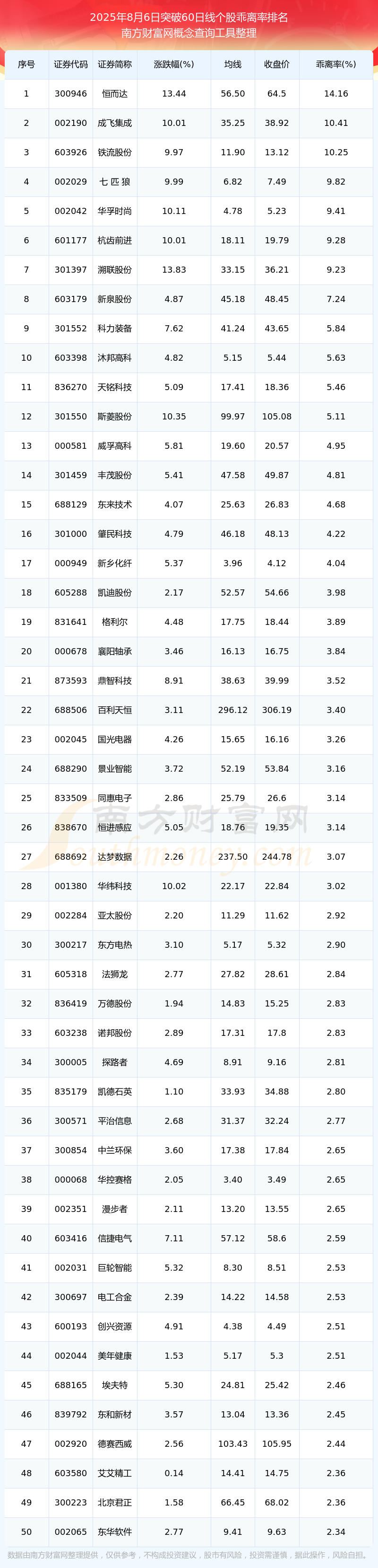 其中市值较大的个股有江西铜业、楚江新材、卡倍亿等2025年8月7日美股行情软件遵循南方家当网观点盘问器材数据统计,截止2025年8月6日收盘,共有259只个股收盘价向上打破了60日线,个中乖离率较大的个股有恒而达、成飞集成、铁流股份、七 匹 狼、华孚时尚等,乖离率分离为14.16%、10.41%、10.25%、9.82%、9.41%。