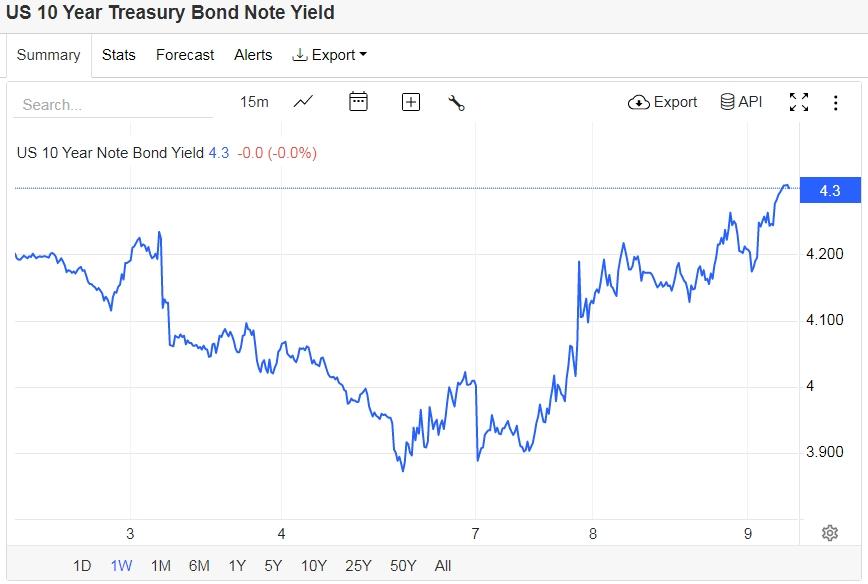 美债收益率一直攀升,基准的10年期美债收益率收报4.304%;对泉币战略更敏锐的两年期美债收益率收报3.738%。