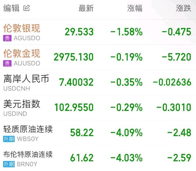 邦际油价延续跌势,再度大跌4%。WTI原油盘中一度大跌超5%,创2021年4月12日往后新低,最终收跌4.09%,报58.22美元/桶;布伦特原油收跌4.03%,报61.62美元/桶。