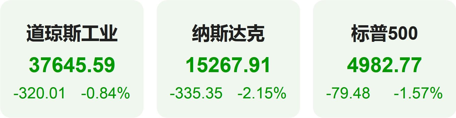 截至收盘,道琼斯指数跌0.84%,报37,645.59点;标普500指数跌1.57%,报4,982.77点,自客岁4月往后初次收于5,000点下方;纳斯达克归纳指数跌2.15%,报15,267.91点。