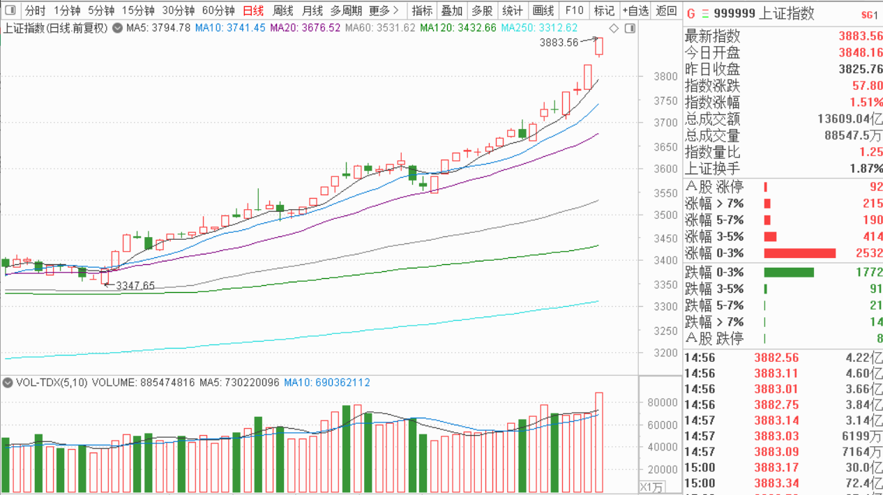 8月25日上证指数收盘上涨1.51%,创业板指上涨3.0%,成交额史上第二次冲破三万亿,小金属、贵金属涨幅居前