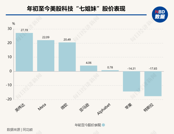两组财报凸显美股科技公司的分解趋向。从股价涌现看,以科技“七姐妹”为例,英伟达、Meta和微软年头从此均上涨超20%,苹果和特斯拉则浮现分明回调,双双下滑约15%。