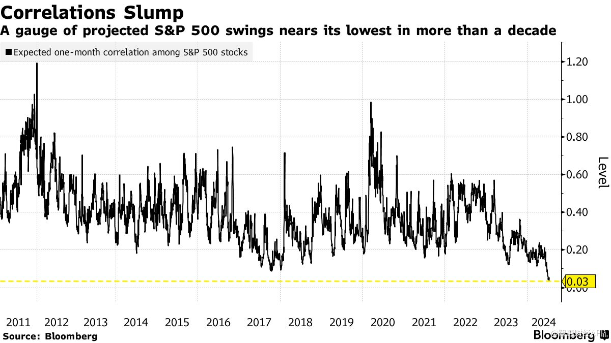 交往员们以为,本财报季股价不会同步震撼,以是很难挑选出赢家。Bloomberg Intelligence汇编的数据显示,纵然通胀正正在消退,但标普500指数板块的前景纷歧,令权衡该指数因素股一个月预期闭系性的目标耽搁正在逾10年来的最低秤谌。读数为1意味着证券走势将同步,目前为0.03。