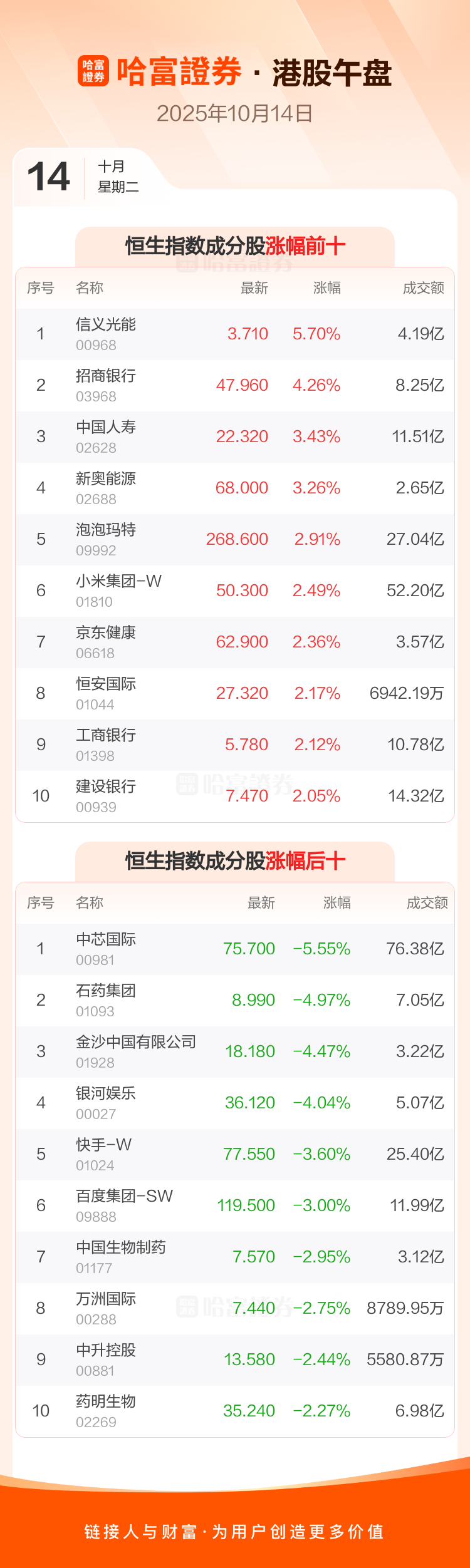 用户个人对服务的使用承担风险2025年10月14日港股10月14日午盘走低 ,恒生指数收报25839.07点,跌50.41点,跌幅0.19%;恒生科技指数收报6066.43点,跌79.08点,跌幅1.29%。恒生指数因素股中