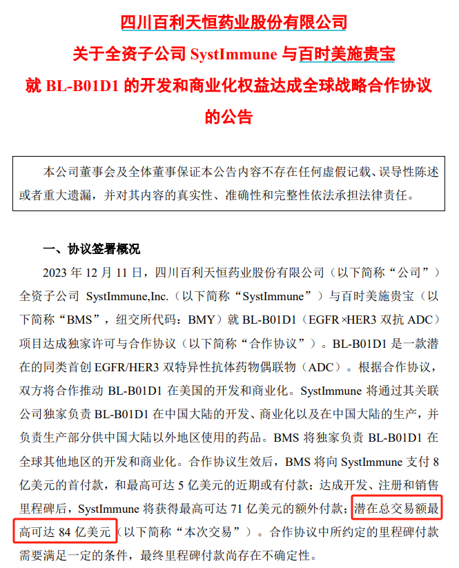 据百利天恒12月12日早间颁布的通告,公司全资子公司SystImmune与百时美施贵宝(下文简称“BMS”)就BL-B01D1(EGFR×HER3双抗ADC)项目竣工独家许可与合营合同。