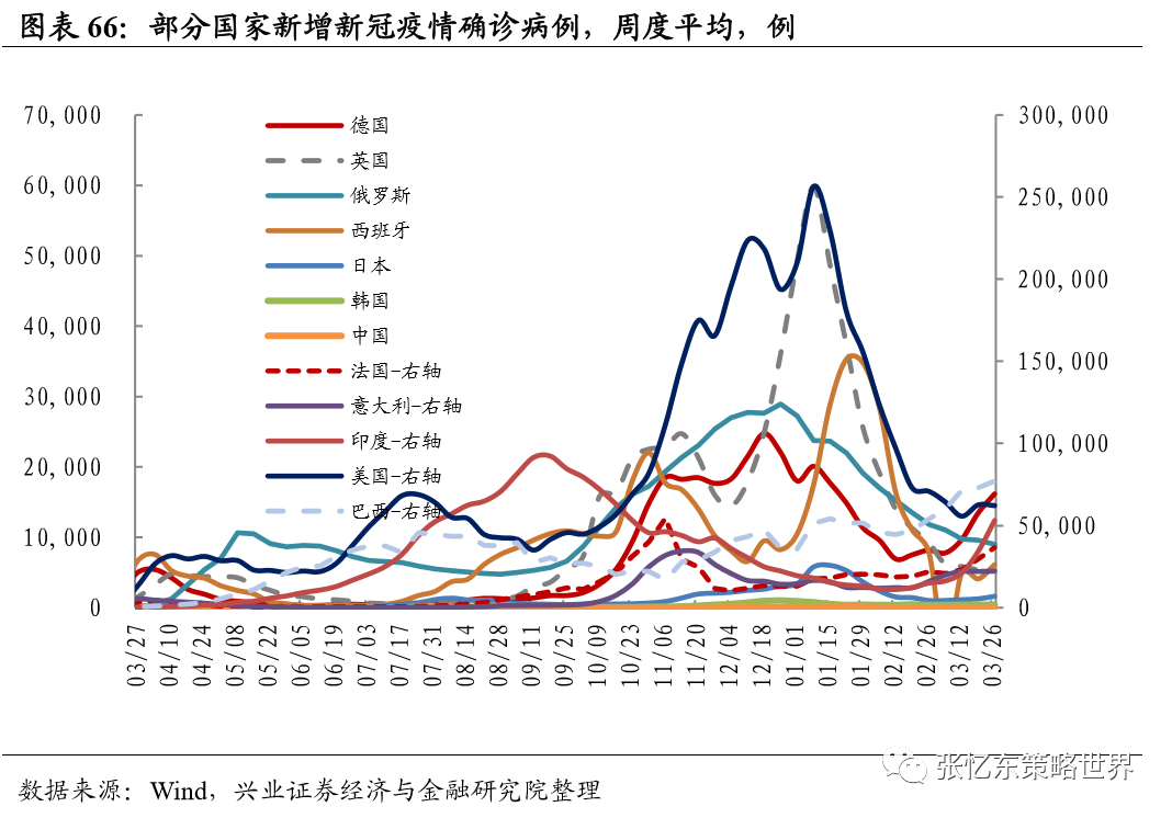 新冠肺炎周度新增确诊病例数:截至3月27日这一周,日均匀新冠肺炎确诊病例中,巴西为7.71万例。美邦为6.21万例,法邦为3.67万例,意大利为2.23万例,德邦为1.62万例,西班牙为0.61万例,英邦为0.55万例。