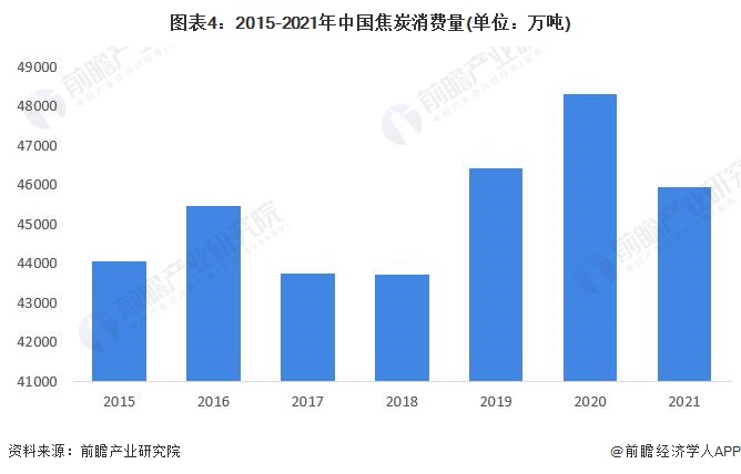 2018年,我邦焦炭消费为43717万吨,钢铁行业同受“去产能”战略影响,关于焦炭的需求增速怠缓。2019年起,我邦焦炭产量、进口量回升速率加快,出口量节减,关于焦炭消费量滥觞有所回暖。2020年消费量延长至48310万吨,2021年经前瞻发端估算我邦焦炭外观消费量有所回落为45935.58万吨。