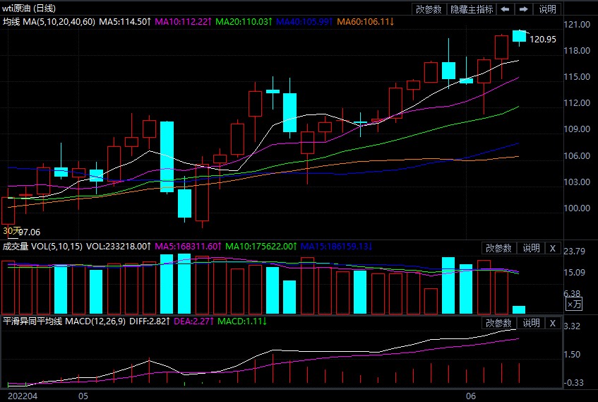 原油上周上涨后下跌然后再次上涨,满堂呈震动上行,当周最低111.1美元,最高120.4美元,周线美元,从周线看油价还将一连上涨,本周上方眷注130美元合口的得失。