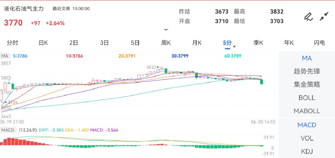 6月13日盘中,液化石油气期货主力合约碰到一波急速下挫,最低下探至3758元。截止收盘,液化石油气主力合约报3800元,跌幅0.55%。