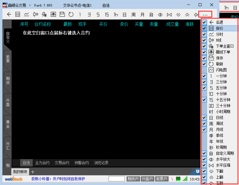 1、最先正在咱们正在本站下载好文华财经期货软件,然后正在桌面找到软件的赶紧办法双击翻开进入到软件的主界面。软件无需上岸账号暗码。直接翻开就可能应用。如下图所示,正在界面上方有一行图标,递次是报价、分时、K线、下单主窗口、留存、改良等,后面另有差别的年光选项,你可能递次举行查看。