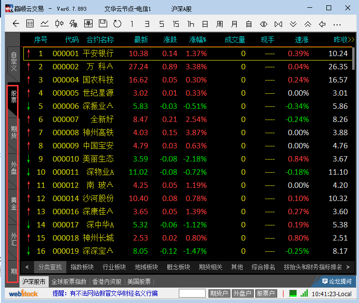 3、正在文华财经期货软件界面左侧咱们可能看到也有一列的数据,递次为自界说、股票、期货、外盘、黄金、外汇等,你可能点击简直的选项来查看,如下图所示,咱们点击股票选项,正在界面中就会展示股票的最新数据、涨跌的幅度等等,你可能己方来判别。