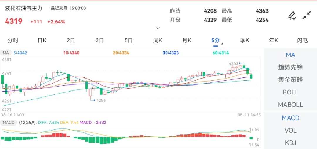 8月11日盘中,液化石油气期货主力合约际遇一波急速上行,最高上探至4343元。截止发稿,液化石油气主力合约报4316元,涨幅2.57%。